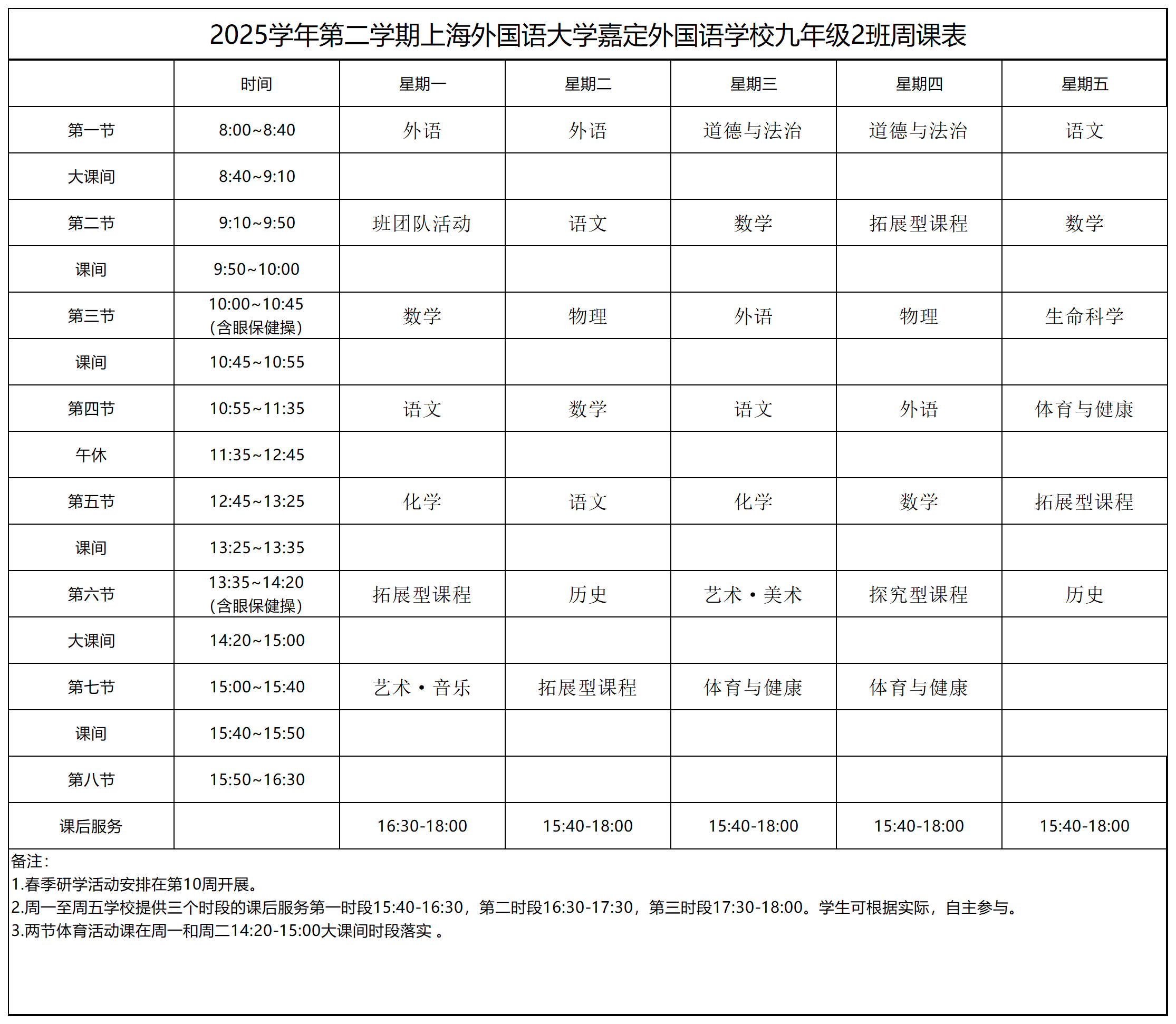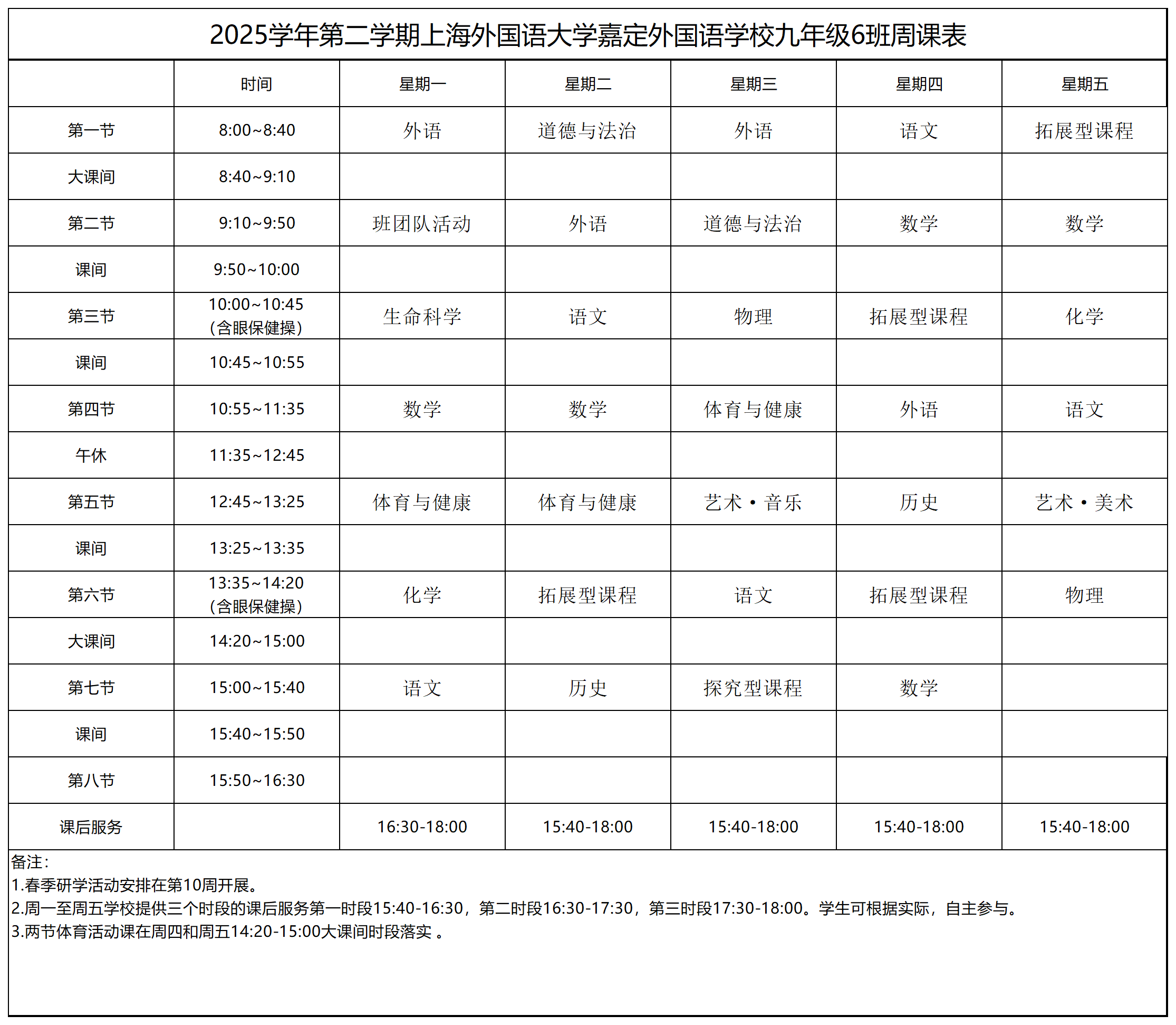 九年级周课表